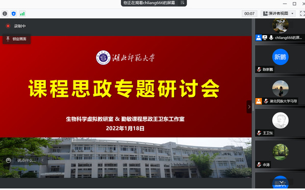 本网讯 为进一步深入推进课程思政建设,充分发挥课程思政教学名师团队圈层效应,交流推广课程思政建设的经验和做法, 1月18日上午,威廉希尔官网生物科学虚拟教研室与勤敏课程思政王卫东工作室通过云端举办了课程思政专题研讨会。会议由生命科学学院副院长陈亮主持,副校长余涛、教务处、学院相关负责人、思政骨干教师以及来自新疆师范大学、湖北民族大学等高校和黄石六中等中学共计100余名教师参加了会议。