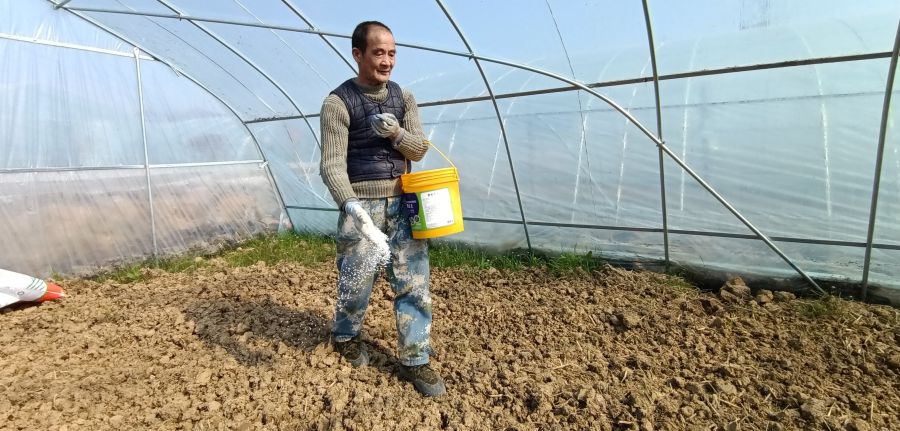 58岁的村民叶作贵,走进暖融融的蔬菜大棚,提起满满的一桶颗粒肥料,熟练地向土地挥撒而去。
