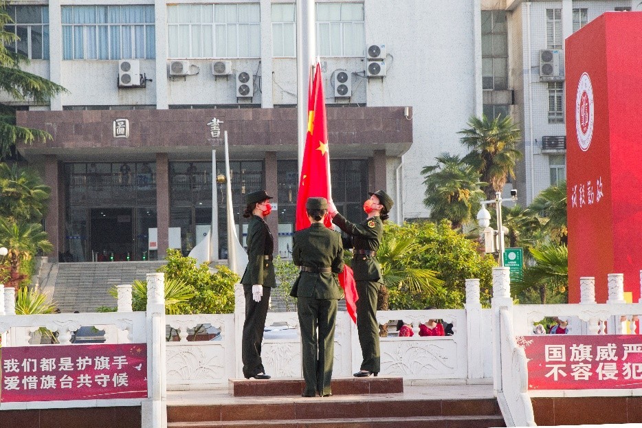早上6时48分,升国旗仪式正式开始。国旗班护旗队员迈着整齐而有力的步伐护卫国旗进场,在雄壮的国歌声中,鲜艳的五星红旗冉冉升起。现场师生向国旗致以庄严的注目礼,深情表达对伟大祖国的热爱和对母校生日的祝福。