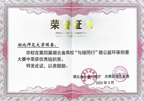 本网讯 近日,湖北省第四届“与绿同行”微公益环保创意大赛获奖结果公布。校团委获优秀组织奖,学校“一路黔行”志愿服务团获得二等奖,数统学院“长风破浪队”和城环学院水环境生态修复实验室获得入围奖。