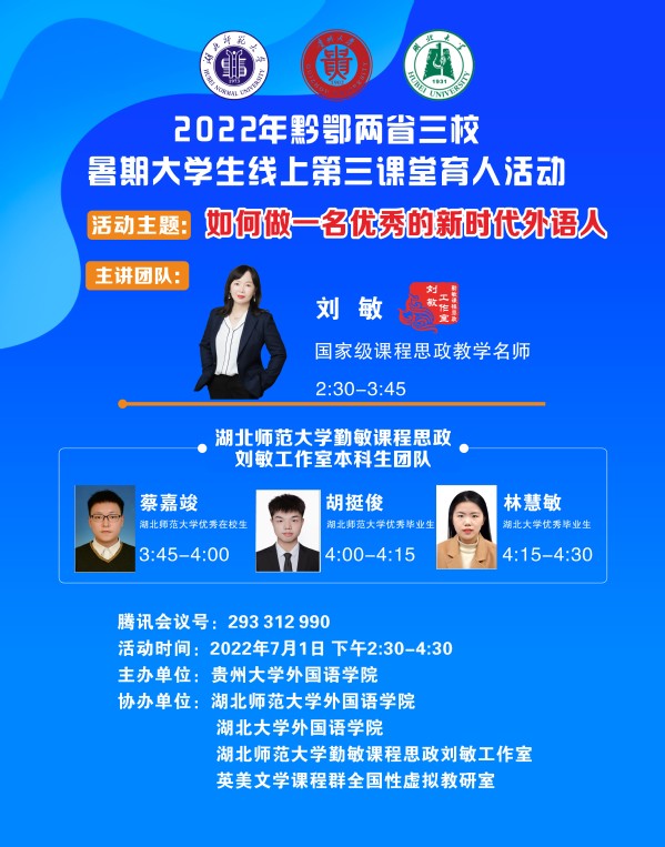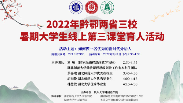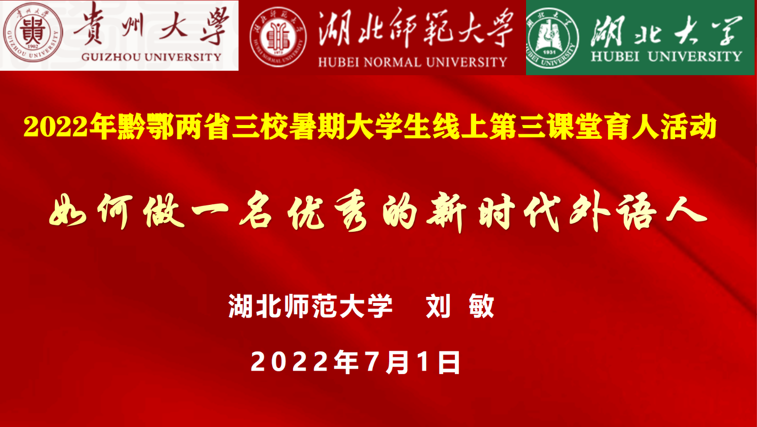 本网讯 为践行三全育人,丰富大学生暑期学习生活,7月1日下午,由贵州大学外国语学院主办,威廉希尔中文官方网站、湖北大学两校外国语学院协办的“黔鄂两省三校暑期大学生线上第三课堂育人讲座:如何做一名优秀的新时代外语人”活动在腾讯会议圆满举办。本次活动由贵州大学外国语学院教学科科长李蓉老师主持,威廉希尔官网刘敏工作室主持人刘敏受邀担任主讲。