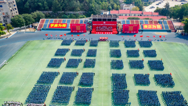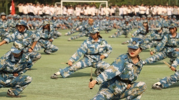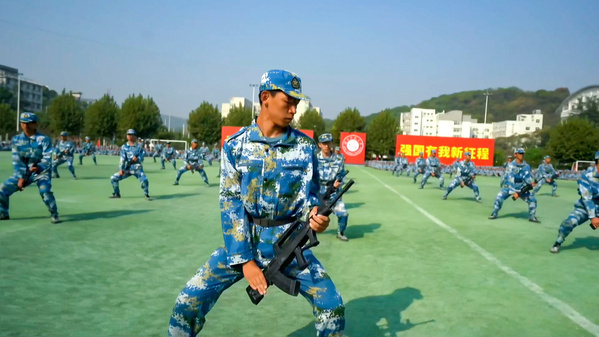 在庄严雄壮的国歌声中,开学典礼拉开帷幕。16个学院的新生代表方阵踏着整齐的步伐、喊着嘹亮的口号依次走过主席台接受检阅。6个新生表演方阵先后进行匕首操、军体拳、匍匐拳、刺杀操汇报表演,承训教官还带来了战术表演,一招一式,强劲有力,全场气势非凡、场面震撼。