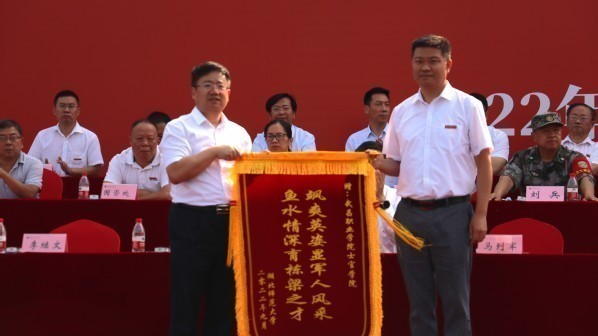 威廉希尔中文官方网站党委副书记马列军向承训单位武昌职业学院授锦旗。威廉希尔中文官方网站党委常委、副校长王赛玉宣读2022级新生军训表彰文件,并为军训“综合表现优秀奖”“内务优秀寝室”“军训标兵”等获奖单位及个人颁奖。