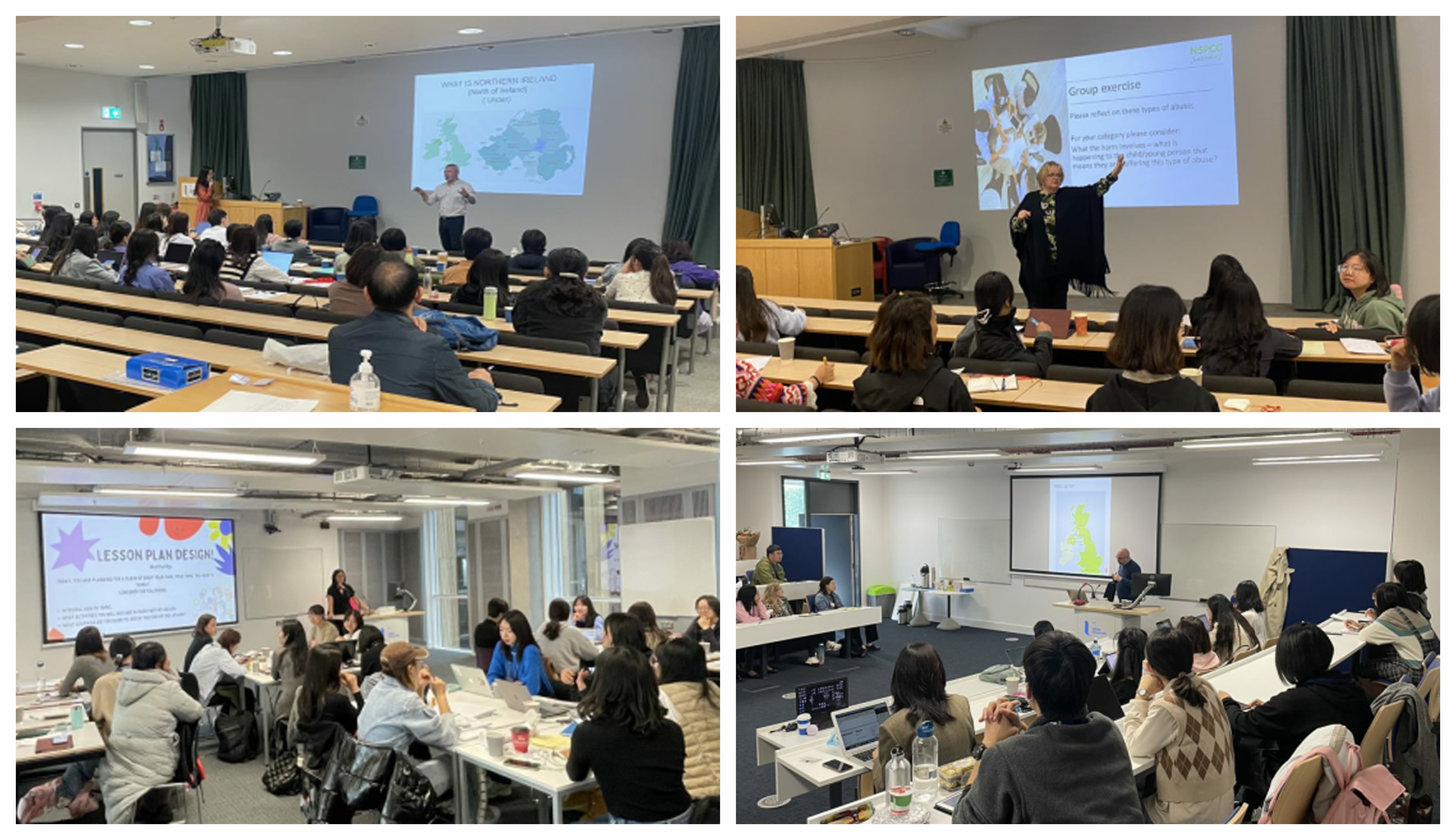 为了让大家更好了解北爱尔兰的政治、历史、地理、人文、教育等,孔院还邀请了6位本地专家、学者进行了相关讲座。9月10日上午,奥斯特大学菲奥娜·麦格拉斯(Fiona McGrath)博士做了《北爱尔兰教育体系》的讲座,对北爱尔兰中小学教育体制、课堂教学规范等进行了详细介绍。同日,北爱尔兰政府国际部前主任蒂姆·罗斯蒂(Tim Losty)做了《北爱尔兰概况》的讲座,向大家全面介绍了北爱尔兰的政治、历史、文化,以及与中国的关系等。9月17日,英国防儿童虐待协会(NSPCC)培训师助理及顾问玛丽·麦卡丹(Mary McCartan)采用PPT解说、分组讨论、答疑解惑等多种形式,向孔院教师详细介绍了英国防儿童虐待的法规及要求。9月24日,奥斯特大学马塞拉·麦卡恩(Marcella McCann)介绍了奥斯特大学员工网络和相关信息;罗伯特·麦克纳马拉(Robert McNamara)博士讲述了北爱尔兰的历史和现状,分析了北爱尔兰与英国和爱尔兰的关系等。10月8号,西南学院孔子课堂负责人菲·科尔(Fey Cole)结合具体案例讲解了北爱尔兰中小学课程大纲、教学设计、教学评估等方面的要求。