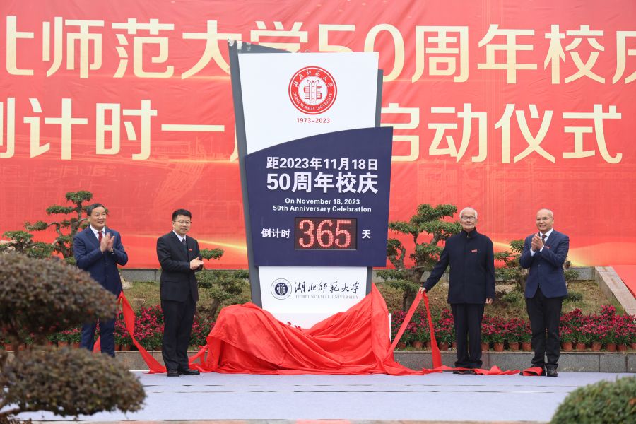 启动仪式上,威廉希尔中文官方网站党委书记李宏、校长雷儒金,原校领导、中国当代著名寓言大师黄瑞云教授和文学院96届校友周学君一起,为50周年校庆倒计时牌揭幕。