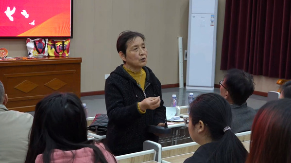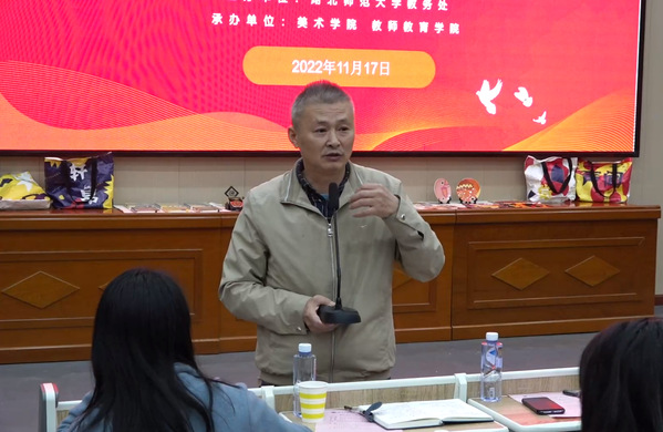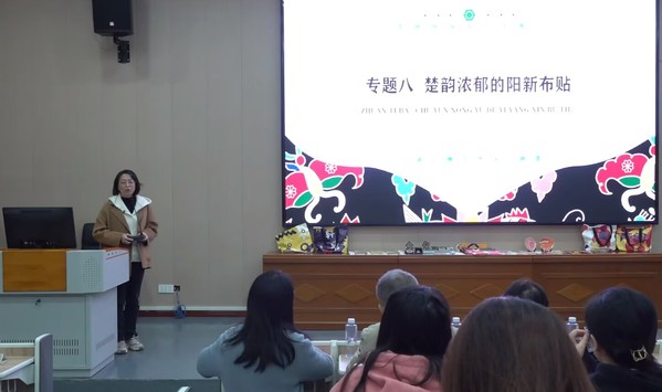 会议分课程示范、交流研讨两个环节。首先,教师教育学院姚菁老师选取《中国传统手工布艺推广》课程中的专题八“楚韵生动的阳新布贴”作了一堂课程思政示范课。她通过视频、小组调研、展示、讲解等方式生动展现了阳新布贴的渊源、分类、色彩和造型,从传统的民间工艺、民俗活动,以及悠久历史等广泛题材出发,挖掘布贴丰富的文化内涵。