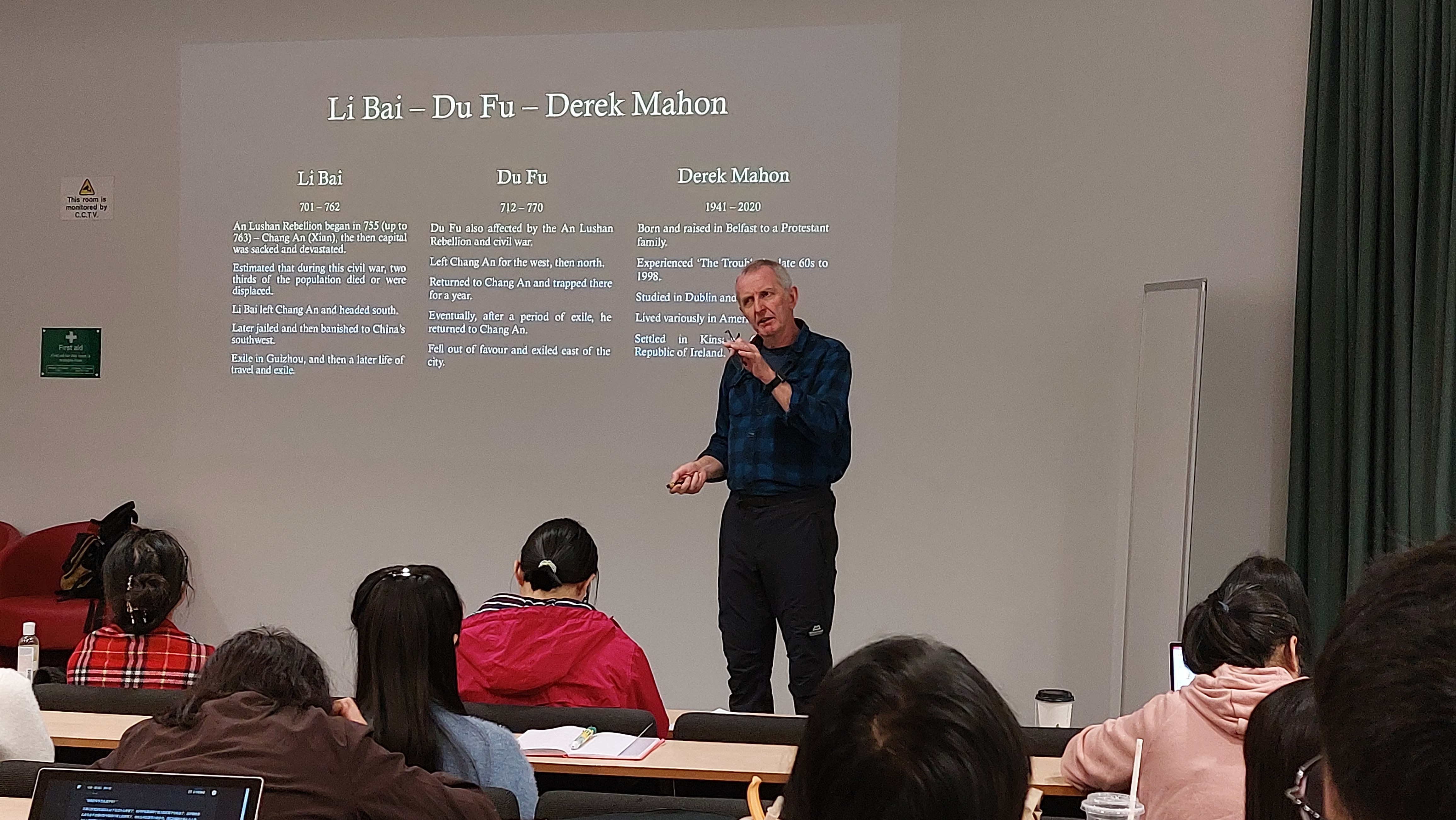 弗兰克·皮尔森博士做了题为《梦见李白:流离失所与李白、杜甫和德里克·马洪的诗歌》的讲座。他在讲座中将中国最负胜名的两位诗人李白、杜甫与英国当代诗人德里克·马洪(Derek Mahon)从诗歌创作和翻译等角度进行了比较分析。他将诗的艺术追踪到遥远的异域与久远的年代,通过这种跨越,表达了诗的亲切、朴素与恒长,使来自不同年代的两国诗人在情感上达到共鸣。通过他的讲座,到场观众深深体会到伟大诗歌并不专属于某个群体,而有着一种跨越民族、超离时空的艺术力量。