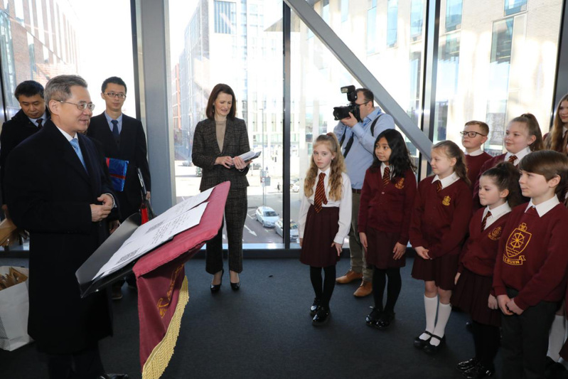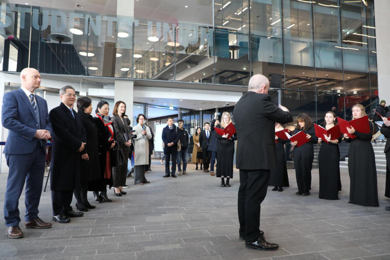 在访问奥斯特大学期间,郑泽光大使一行进入奥斯特大学贝尔法斯特校区BC座大厅时,奥斯特大学合唱团在孔院教师的扬琴伴奏下,用中文演唱《我爱你中国》,感情真挚、歌声悠扬,赢得现场观众阵阵掌声。
