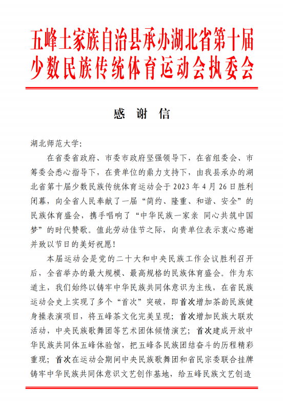 通过本次少数民族运动会的演出活动,同学们切身地感受到了土家族舞蹈、音乐及风俗文化的独特魅力,增强了民族自信心和自豪感,并进一步提升了专业实践能力。同学们精彩的表演水平及优秀的团队精神受到了导演组的一致好评,并在演出结束后收到了组委会的感谢信。