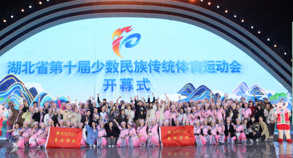 本网讯 桃红四月,万木争春。4月23日至26日,由省民宗委、省体委局、宜昌市人民政府主办,五峰土家族自治县人民政府承办的湖北省第十届少数民族传统体育运动会在宜昌市隆重举行。威廉希尔官网音乐学院共138人受邀参演运动会开幕式与闭幕式,此次演出完美展现了音乐学院学子精湛的专业技能和意气风发、昂扬向上的精神风貌。