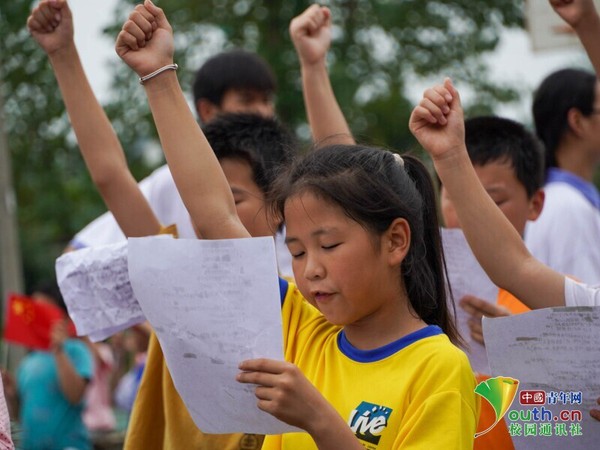 图片发自中青校园App,图为五年级学生在国旗下朗诵《请党放心,未来有我》(中国青年网通讯员邓远帆摄)