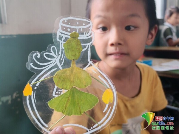 在这短短的几天中,我发现小琳十分聪明,她的书签是融合了除植物以外的贴纸元素。其他孩子都很愿意动手实践,一大半的孩子都主动上台分享,我发现,原来他们也是在慢慢配合我,贴近我。即使她们有时候有些叽叽喳喳,但每一个孩子的可爱都让我欢喜,我也享受我的火花与孩子们的火花碰撞摩擦的过程,因为最后产生的是每一次打动我的瞬间。实践课后的第二天,一个小男孩给我带来了他做的第二个书签,是银杏树叶做的人形图案。那骄傲开心的神情刻在我的脑海里。