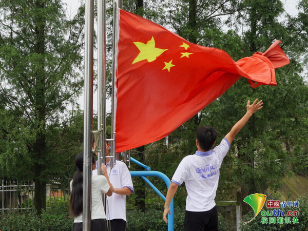图为实践队员和一名五年级同学一起升旗(中国青年网通讯员邓远帆摄)