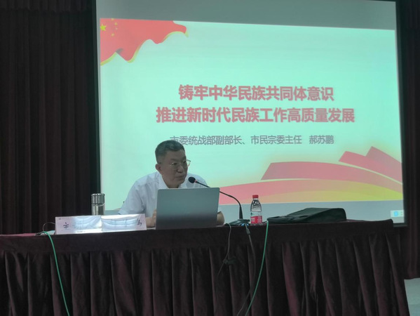 郝苏鹏结合当前民族宗教工作实际,从“铸牢中华民族共同体意识,推进新时代民族工作高质量发展”和“坚持我国宗教中国化方向,做好新时代党的宗教工作”两大方面,详细解读了中央民族工作会议、全国宗教工作会议以及省相关会议等会议主要精神,深刻分析目前民族宗教工作面临的新形势新任务并就深入贯彻落实中央、省委民族工作会议精神和全国、全省宗教工作会议精神,做好当前民族宗教工作提出了明确要求。报告主题鲜明、内涵丰富、数据详实、深入浅出,具有很强的理论性和政策性、针对性和指导性。
