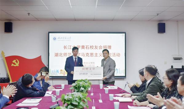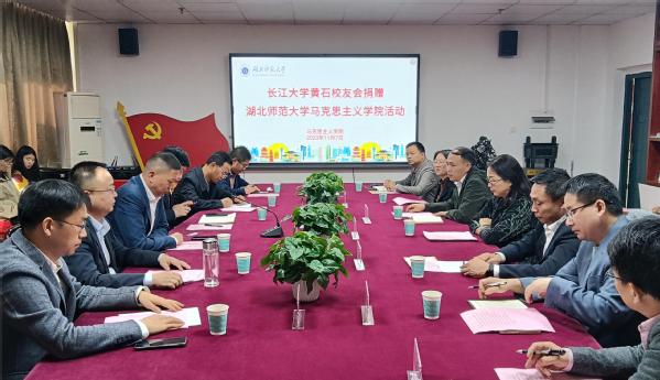 本网讯 (摄影 陈克琴,郑海洋), 11月7日上午,学校在人文楼21B107会议室举办长江大学黄石校友会捐赠活动。湖北领道律师事务所负责人、长江大学黄石校友会会长孟晟,中国人寿黄石分公司负责人吴思涛,新华保险黄石分公司负责人程启敏,中国石油黄石分公司负责人涂德力,湖北溥博律师事务所合伙人、长江大学黄石校友会副会长田超,湖北恒春农业发展有限公司董事长张志敏,学校校友工作处处长刘洋,马克思主义学院全体领导班子,教师代表俞玲及学生代表参加了本次活动。活动由马克思主义学院党委书记程焰主持。