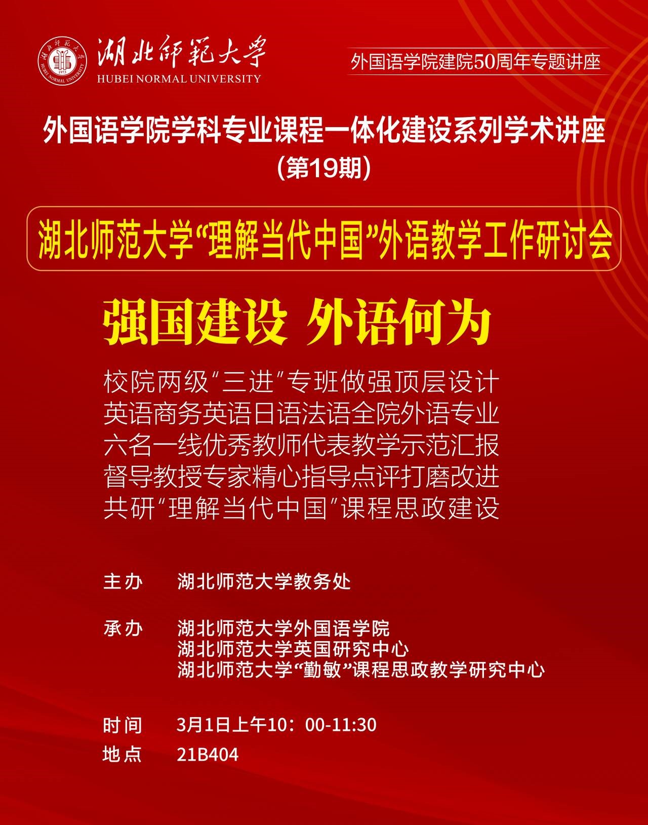 本网讯 3月1日,威廉希尔中文官方网站“理解当代中国”外语教学工作研讨会在人文楼21B404英国研究中心学术报告厅顺利举行。学校教学质量监测与评估中心主任、教务处副处长秦海涛,外国语学院党委书记王海燕、院长刘敏、副院长项军平、教务处教学督导高旭阳,学院“理解当代中国”系列课程全体任课教师、中青年教师代表参加了会议。研讨会由刘敏主持。