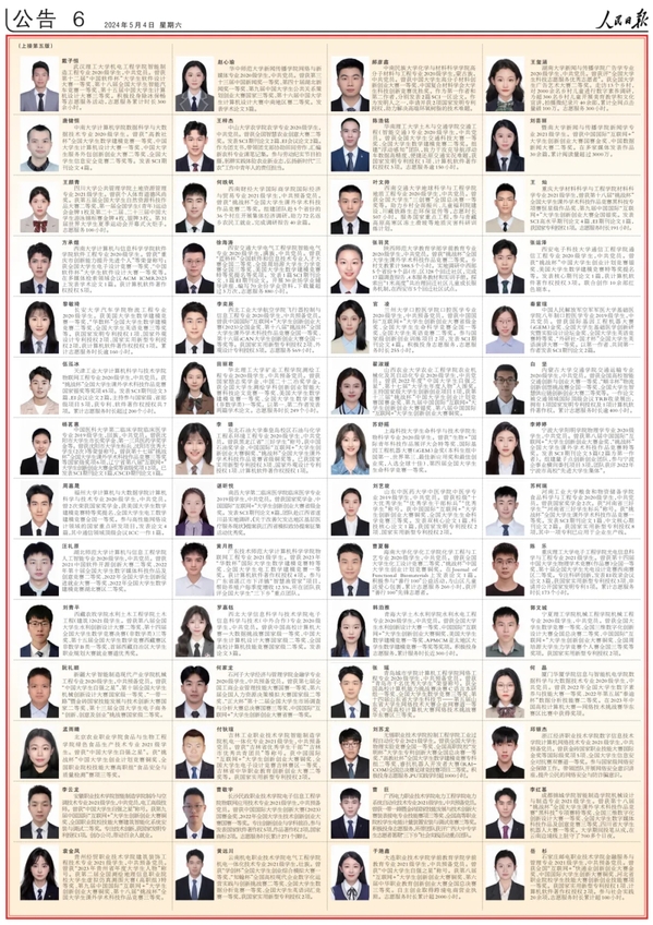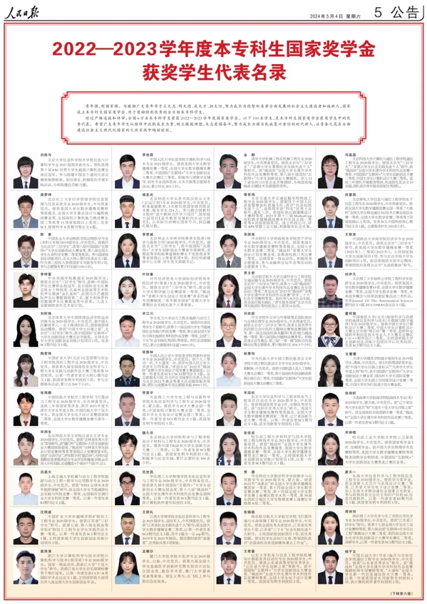 日前,《人民日报》选登其中100名本专科生国家奖学金获奖学生优秀代表、100名中等职业教育国家奖学金获奖学生优秀代表和100名研究生国家奖学金获奖学生优秀代表。
