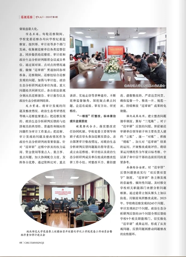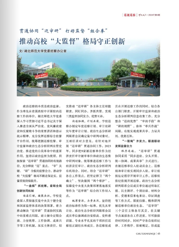 近日,中共湖北省纪律检查委员会、湖北省监察委员会主办的《楚天风纪》(2024年第4期)刊发威廉希尔官网党委巡察办文章《贯通协同“巡审研” 打好监督“组合拳” 推动高校“大监督”格局守正创新》。