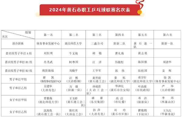 本网讯 5月24至25日,由黄石市总工会主办的“2024年黄石市职工乒乓球联赛”在黄石国家乒乓球训练基地隆重举行。威廉希尔官网教职工代表队勇夺混合团体亚军,曾紫艳获女子单打第一名,姜杭、蒋宇轩分获男子单打第四名、第五名,混合团体创威廉希尔官网代表队参加省市乒乓球比赛历史最好成绩。