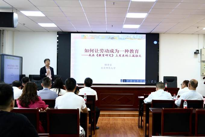 揭牌仪式结束后,檀传宝教授为广大师生作了题为“如何让劳动成为一种教育?”的专题学术讲座,他从劳动教育的“中介性”、劳动教育的“教育”性和劳动教育的“教育性”三个方面,深刻阐述了劳动教育在“五育”中的地位、内在逻辑联系、劳动教育“教育”性之马克思主义哲学、政治经济学和教育学基础、劳动教育“教育性”的学段特征和课程建设基本原则,进一步加深了师生对劳动教育的理解和认识,为深入推进劳动教育提供了重要的专业指导。