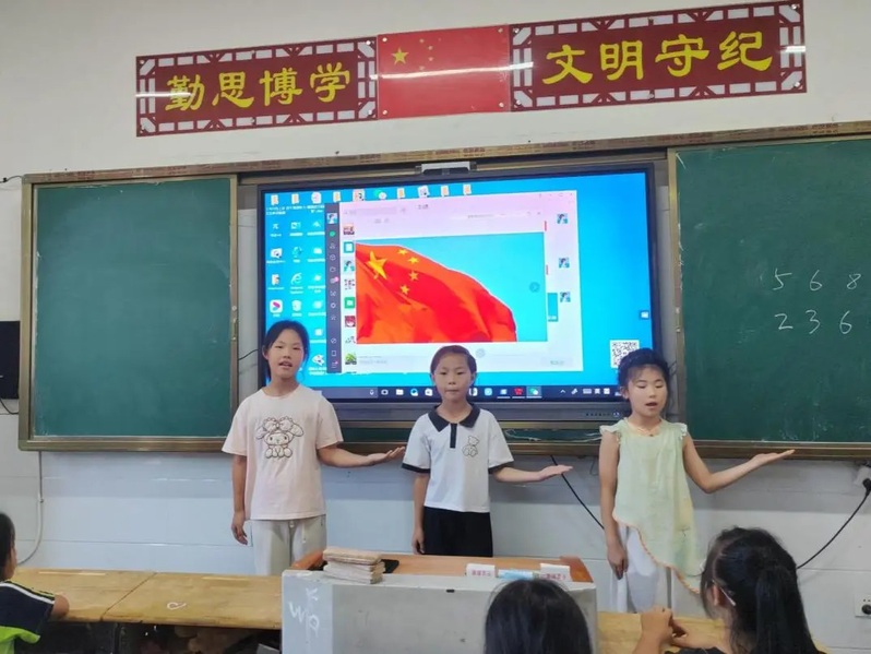 推普实践队携手“彩虹计划”志愿服务团,一同走进阳新县汪家珑小学、渡口小学、滑石小学,针对留守儿童的特点和需求,开展了一系列国家通用语言文字推广普及课程。如“推广普通话,写好规范字”的书法课程、“我是小小推普员”的绘画课堂、“典耀中华读书行动”的阅读课程,以及“三字一话”“红色经典歌曲”和“中华经典朗诵”等赛事活动。授课过程中,借助国家智慧教育读书平台、中国语言文字数字博物馆等数字推普资源,以寓教于乐的方式,使孩子们用普通话“诵、写、讲”。