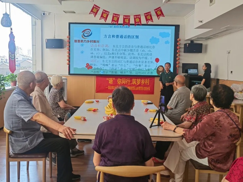 推普实践队走进山西运城爱家养老院,开展普通话基础发音、听力训练等培训课程,通过课堂交流的方式向老年人们推广普通话,助力老人们提高听力技能,让他们能够与家人和社会保持良好的沟通,有效应对日常生活中的各种情况,从而减少因听力问题导致的社会隔离现象。另外,推普队员还设置了普通话宣讲展台,引导老年人用方言介绍自己以及家乡的特色,并协助其纠正读音,极大地充实了老人们的闲暇时光,提高了他们的交流能力。