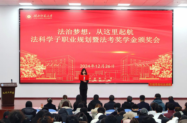 本网讯 12月26日,经济管理与法学院在人文楼文都讲堂举办了法科学子职业规划暨法考奖学金颁奖大会。校党委副书记、校长雷儒金,瑞达法考湖北校区负责人徐刚岭,瑞达法考金牌讲师李劲松,经管法学院全体领导班子、法学系教师和学生代表出席了此次大会。