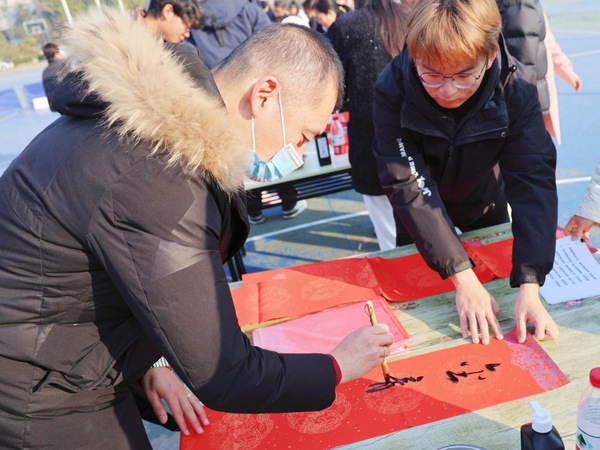 校党委副书记、工会主席马列军代表学校感谢各位书法家并讲到,春节是中华民族重要的传统节日,春联是优秀传统文化形式。手写春联情意深重,一是传承中华优秀传统文化,二是以春联为载体,烘托节日氛围,丰富教职工的文化生活。严严寒冬日,暖暖职工情。下一步,校工会将开展春节期间慰问服务关爱行动,切实为群众“做好事、办实事”。(摄影 学通社江振宇、吴欣然)