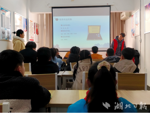 首先,志愿者郑智豪、吴佳丽向孩子们介绍了春节贴春联的习俗以及春联的起源和意义,使孩子们对春联有了初步的了解。随后,志愿者为孩子们展示书写春联的正确姿势和笔法技巧。