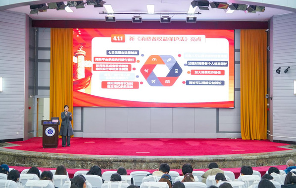 主会场宣讲活动由黄石市消费维权法律服务中心公益律师袁三慧主讲,围绕网购侵权、直播带货纠纷、线上知识付费陷阱等热点问题,剖析消费陷阱案例,解析《消费者权益保护法》要点,并现场演示证据保留、协商调解等实用方法。互动环节,学生就“遭遇虚假促销如何取证”“霸王条款如何应对”等现实问题,寻求律师现场答疑解惑。