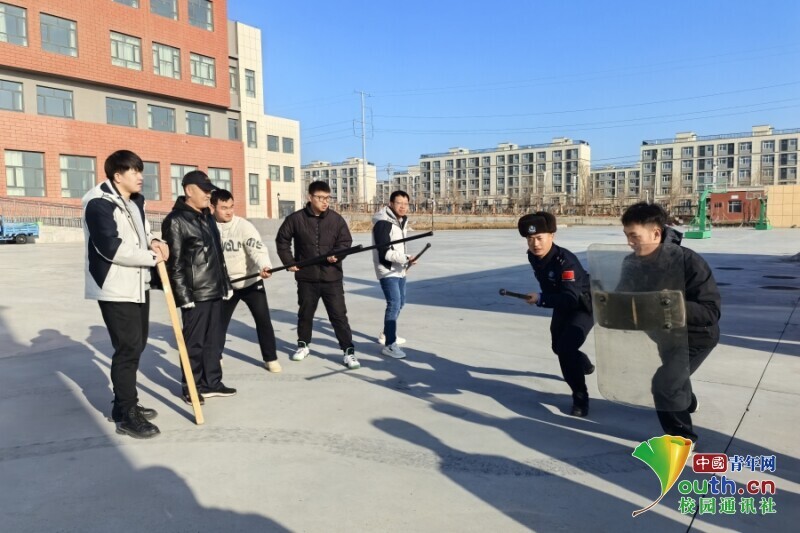 图为实习队员参加学校组织的反恐防暴应急演练,当地民警演示防暴器具的使用。