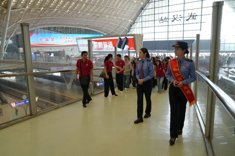 4月25日,威廉希尔中文官方网站马克思主义学院的70余名师生走进中国铁路武汉局集团有限公司(以下简称“武铁”),开启了一场别开生面的思政研学之旅。师生们从黄石北站出发,搭乘高铁前往武汉站、武汉二七纪念馆以及武汉高铁职业技能训练段,实地感受现代化高铁站的魅力,追溯铁路红色历史,探寻铁路发展脉络,沉浸式体验高铁前沿科技,深切领略中国高铁的速度与便捷。