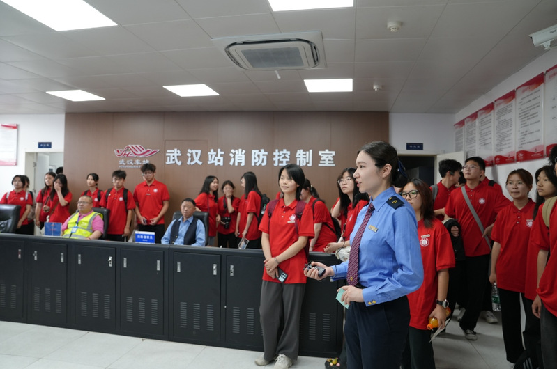 当日9时21分,研学师生乘坐D5774次列车准时抵达武汉站。在武汉车站景观长廊,学生们现场感受武汉站独特的建筑美学和浓厚的文化氛围,到消防控制室和安全生产指挥中心深入了解高铁的安全运营安全保障措施,车站安排的“服务礼仪标准展示”赢得了学生们的阵阵掌声。随后,研学师生来到“二七纪念馆”,深入了解了中国工人阶级的革命精神和中国铁路发展历程,见证铁路强国之路。在武汉高铁职业技能训练段,师生参观动车组简易模拟驾驶实训室、客运实训基地和实训场,触摸未来新时速,解锁高铁发展背后的智慧密码。
