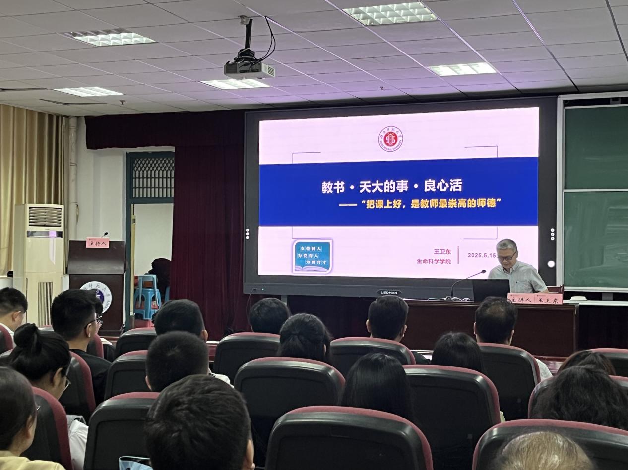 本网讯 5月15日,教师工作部在信息大楼报告厅举办青年教师师德讲堂,学校近两年新入职的近两百名教师参与。本次讲堂特邀黄石市十佳师德标兵生命科学学院王卫东教授担任主讲人,王卫东教授以“把课上好,是教师最崇高的师德”为主题,结合自身从教经验,为青年教师传授师德涵养与教学实践的真谛。