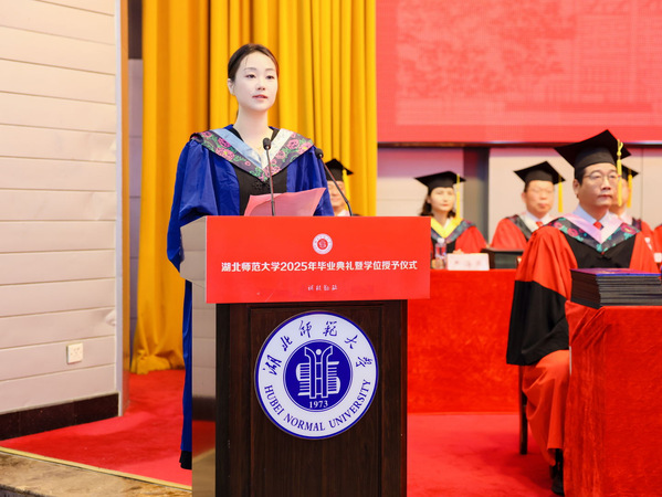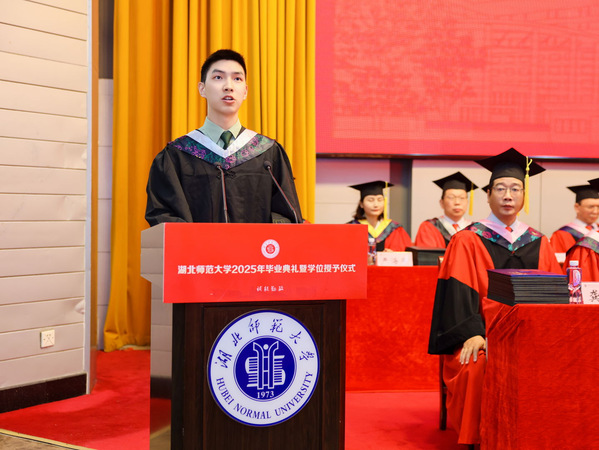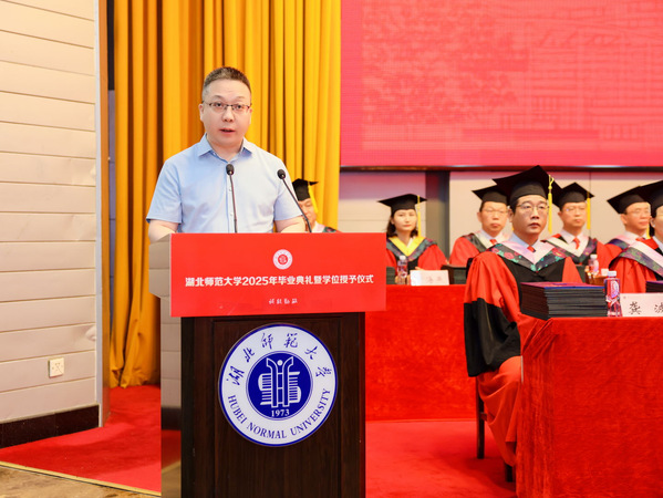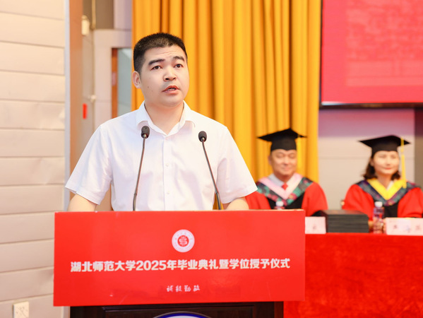 校长雷儒金以《从湖师大再出发 做新时代追梦者》为题为毕业生送上深情寄语和美好祝福。他代表学校向顺利完成学业的5351名本科生和608名硕士生表示祝贺。他谈到,2025届毕业生与学校在双向奔赴中成为命运相连的共同体,携手度过了一段极不平凡的岁月。伴随着同学们的成长进步,学校也在求新求变,共沐建党百年荣光,亲历党的二十大胜利召开,见证热烈的50周年校庆,共同开启了学校建设特色鲜明、国内一流、高水平师范大学新征程。他期望毕业生坚定理想信念,做胸怀家国、矢志不渝的追梦人;练就过硬本领,做知行合一、开拓创新的奋斗者;甘于吃苦奉献,做扎根基层、砥砺前行的开拓者。他勉励同学们要弘扬“自强不息、尚诚厚德”的湖师精神,奔赴更为广阔的天地,服务社会、报效国家,在建设中国式现代化的道路上挺膺担当。