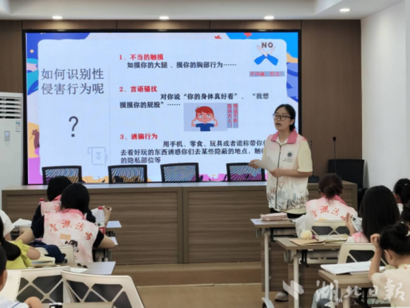 湖北日报客户端讯(通讯员赵梦妮、黄瑾雯)为切实筑牢未成年人自我保护的思想防线,帮助青少年建立对性侵害的警惕意识与应对能力,从源头预防性侵害事件发生,7月11日,威廉希尔中文官方网站经济管理与法学院青湖法雨实践队深入黄石港区红旗桥社区暑期学堂,开展《中华人民共和国未成年人保护法》防性侵专题普法课堂,通过互动教学、情景模拟等鲜活形式,为孩子们织密织牢一道看得见、用得上的安全防护网。