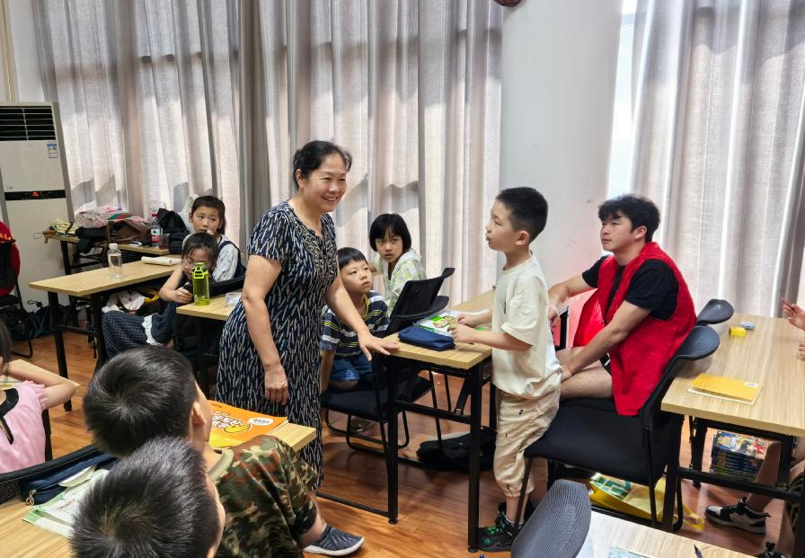 7月14日上午的桂花湾社区暑期课堂里,“普通话可不是凭空来的哦!”国家级普通话测试员邓华教授的话音刚落,孩子们的目光便齐刷刷地聚焦过来。课堂上,她巧妙融合普通话的起源、拼音字母的奥秘与朗朗上口的诗词,一个个枯燥的知识点经她生动讲解,变成了孩子们爱听的小故事;平仄起伏的诗词配上标准的普通话诵读,像串串音符在教室里跳动。邓老师时而模仿童趣的语调,时而用夸张的表情讲解字词,连平时安静的小朋友也忍不住加入“答题大战”。课后,程小华同学抱着笔记本笑盈盈地说:“这堂课比动画片还好看,我学到了好多知识呀!”。