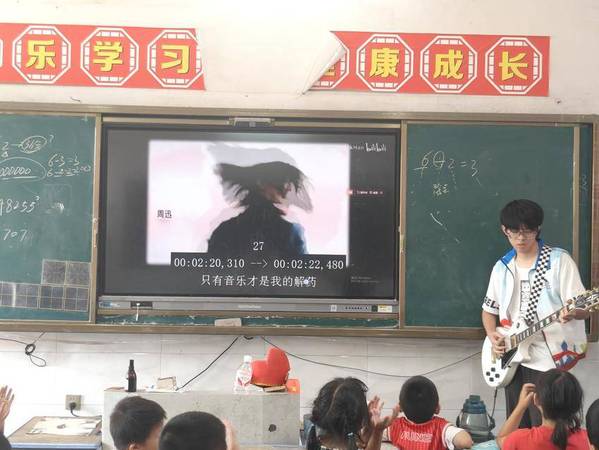 (队员康皓宇为孩子们弹唱《只有音乐才是我的解药》)