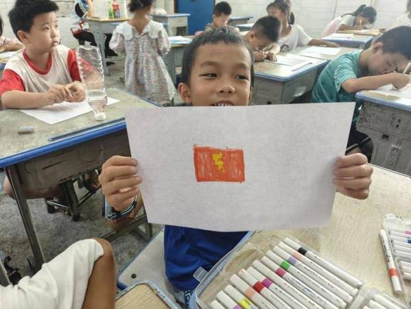 课堂最后,为强化学习成果,课堂设置“我心中的队旗”创意绘画环节。学生在实践队指导下,用彩笔勾勒队旗轮廓,以金黄填涂星星火炬。一幅幅充满童真的画作中,既有对旗帜元素的精准还原,也不乏“红领巾飘扬在太空”“少先队员守护青山绿水”等天马行空的想象。作品完成后,孩子们骄傲地举起画作合影,眼神中闪烁着成为少先队员的渴望。