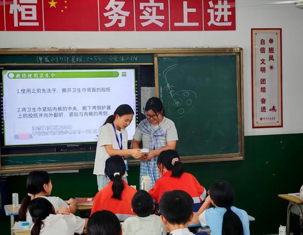 支教老师宗庭竹和学生一起演示卫生巾的正确使用方法 程晓丹供图