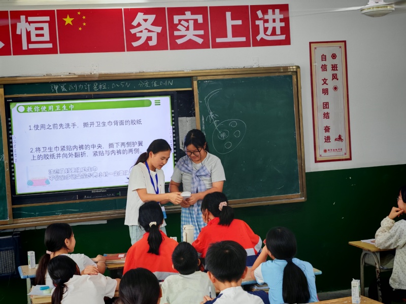 支教老师宗庭竹和学生一起演示卫生巾的正确使用方法