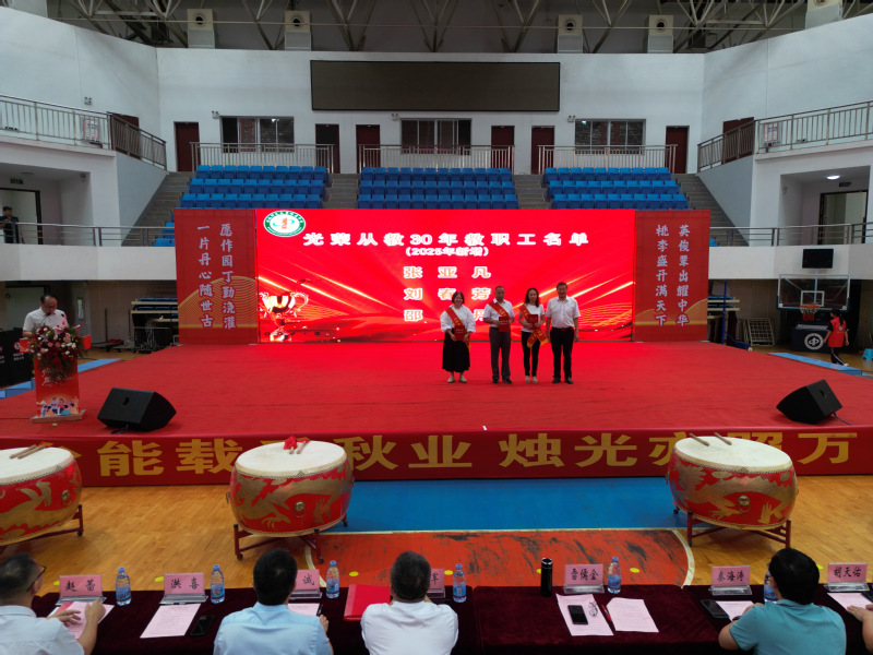 庆祝大会上,雷儒金一行为受到表扬的市级、校级优秀教师团队和个人颁奖。雷儒金校长代表学校党委、行政,向附属黄石一中广大教师和教育工作者致以节日祝福和诚挚问候。胡艳军在大会上致辞,代表学校对附属黄石一中2025年再次获得“黄石市高中教学质量卓越贡献奖”表示祝贺,希望附属黄石一中充分利用好校地共建体制机制,进一步强化与学校在人才引进、师资培训、课题研究、教科研指导、教育实习、成果培育等领域的合作,加快实现教育教学质量全面提升,早日建成鄂东南地区有人文底蕴、科技特色和重要影响的一流高级中学。