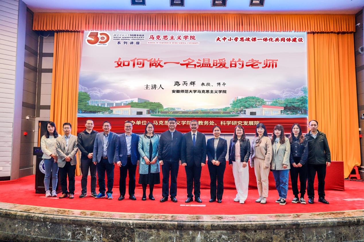 4月9日晚,党的二十大代表、全国模范教师、全国最美思政课教师、安徽师范大学马克思主义学院博士生导师路丙辉教授做客威廉希尔官网50周年校庆系列讲座,为全校优师生做题为“如何做一名温暖的老师”专题讲座。校党委副书记马列军、教务处处长胡艳军,黄石市教育局副局长庞江华,以及各专业优师生负责人和黄石市中小学教师代表等参加了此次讲座。本次讲座由马克思主义学院党委书记程焰主持。