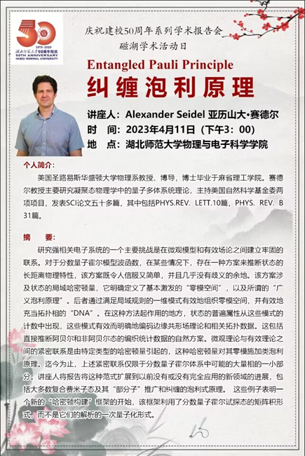本网讯 4月11日下午,纠缠泡利原理——庆祝建校50周年系列学术报告会在信息大楼10508顺利举行。本期磁湖学术活动主讲嘉宾是亚历山大·赛德尔教授,赛德尔教授是美国圣路易斯华盛顿大学物理系终身教授、博导,博士毕业于麻省理工学院。赛德尔教授主要研究凝聚态物理学中的量子多体系统理论,发表SCI论文五十多篇。物理与电子科学学院的青年博士教师和研究生代表参加了此次报告会。