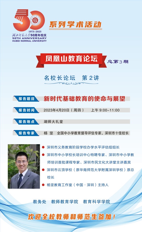 据了解,学校教务处、教师教育学院将充分利用50周年校庆系列学术活动契机,聚焦师范生培养模式改革,以教师教育领域实践问题为导向,邀请名校长、名师、名教研员、名班主任、名局长等做客凤凰山教育论坛,为学校教师教育高质量发展贡献专业智慧。