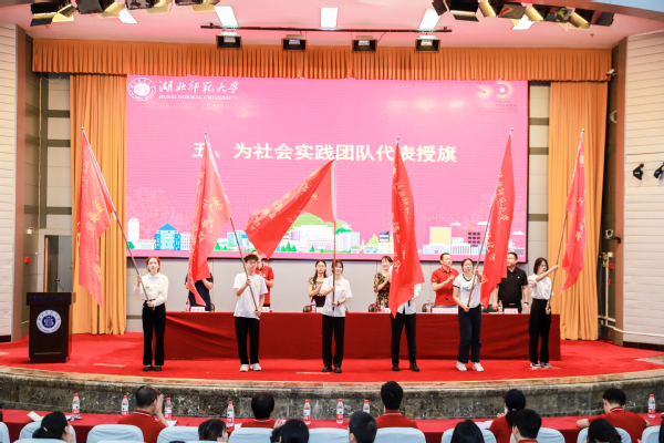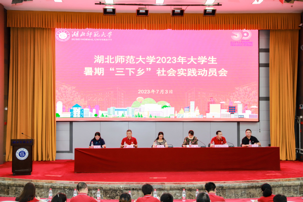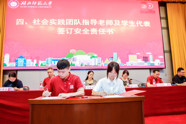 动员会在庄严的国歌声中拉开序幕。学工部负责人介绍了学校2023年大学生暑期“三下乡”社会实践活动方案的主要内容。历史文化学院辅导员杨绍浩、校社调中心学生万格格分别作为实践团队指导老师和学生代表发言。社会实践团队指导老师及学生代表还分别签订了社会实践安全责任书。随后,与会领导为社会实践团队代表授旗。